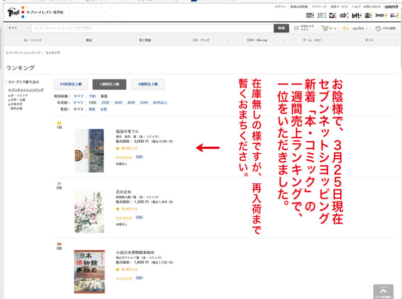 無名の出版社の書籍が「アマゾン新刊トップ」とか、セブンネットショップ」の売上げ一位など、これまででは考えられないことでした。