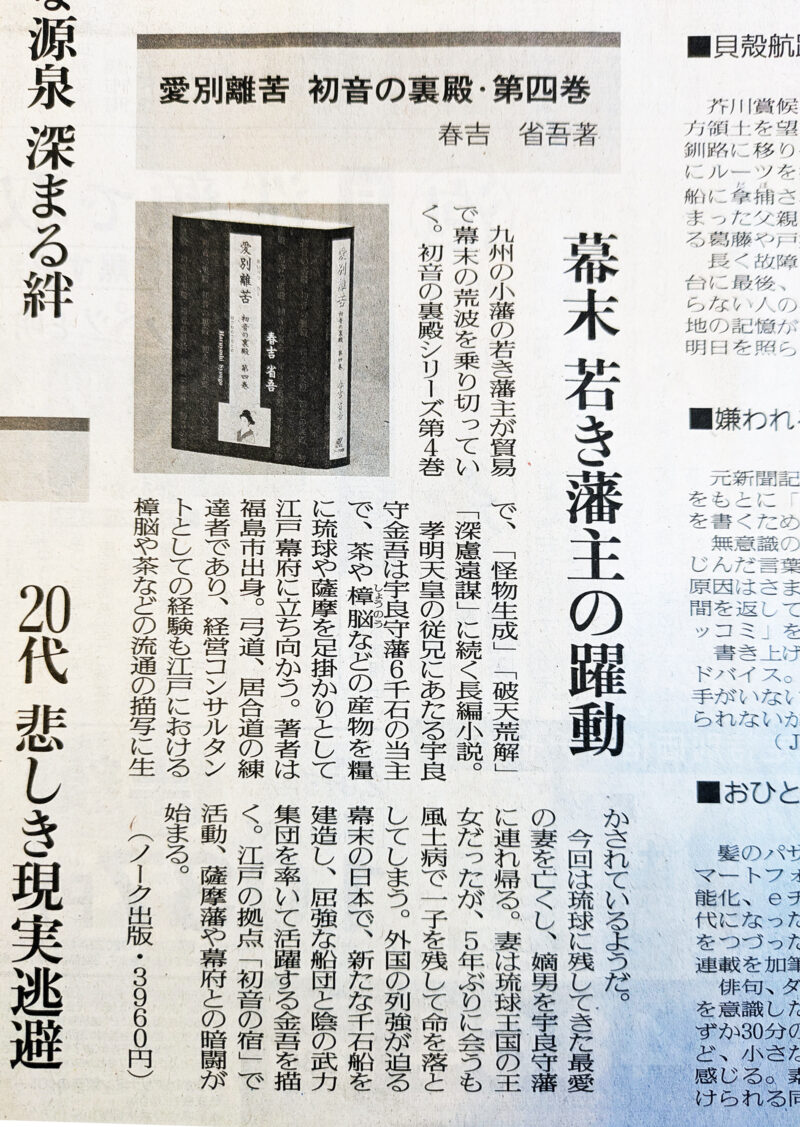 ◆トップの写真は、3月28日・福島民友新聞(書評欄の記事)。民友さんは、私の地元の新聞社ですが、四季四部作歴史時代小説の最初の出版から現在に至るまで、全て紹介してもらいました。そのよしみで今回も早々と書評を書いてもらいました。「献本」したのはたった一ヶ所ここだけです。過去に大手の新聞社に「献本」したことがありますが、読まずに古本屋に売って彼らの「お小遣い」になった経緯があり、以来、一切止めました……。